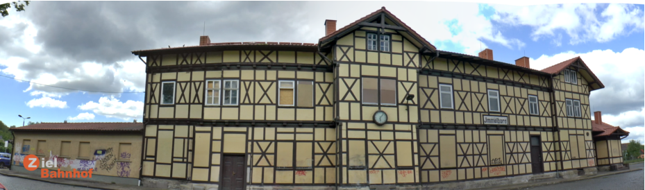 Das zweistöckige Stationsgebäude mit Satteldach auf T-förmigen Grundriss war ein variierter Typenbau aus Fachwerk. Im Erdgeschoss gab es Warteräume, Fahrkarten- und Gepäckschalter sowie weitere Diensträume und einen Güterboden. Daneben befand sich ein Aborthäuschen ebenfalls aus Fachwerk. Im Nordwesten war ein einstöckiger Fachwerkanbau für die Bahnhofsgaststätte errichtet worden. Im Erdgeschoss befanden sich Wartesäle sowie Fahrkarten- und Gepäckschalter, ein Güterboden und weitere Diensträume. Im Obergeschoss waren Dienstwohnungen und eine Wohnung für den Bahnhofswirt W. Müller entstanden.Der Hausbahnsteig erhielt eine Teilüberdachung aus Holz.Der Bahnhof gehörte 1938 zur RangklasseIII.Weitere Streckeneröffnungen, Ausbauten oder Änderungen•1862 wurde ein neuen Güterschuppen errichtet, da der Güterboden zu klein geworden ist.•1867 entstand eine zweite Ladestraße.•1880 verdoppelte die Bahn praktisch das Stationsgebäude um einen Anbau auf T-förmigen Grundriss, der dem Baustil dem Hauptgebäude angepasst wurde.•Am 1. August 1889 eröffnete die WEG ihre 8,6 Kilometer lange Strecke nach Steinbach (Kr. Meiningen). Dafür wurde die Gleisanlage erweitert. Immelborn wurde zum Trennungsbahnhof. Die Werrabahn erhielt drei Hauptgleise mit einem schmalen befestigten Mittelbahnsteig.•Im März 1892 erhielt der nördliche Bahnhofskopf ein dreiflügeliges Einfahrsignal. Somit war die Einfahrt in Richtung Liebenstein gesichert.•Wahrscheinlich in den 1930er-Jahren wurde ein Stellwerksgebäude am Bahnübergang errichtet.•1956 erhielt ein neues Kieswerk einen Gleisanschluss.•Am 4. August 1968 wurde der Personenverkehr nach Steinbach eingestellt.•Am 13. Januar 1973 stellte die Deutsche Reichsbahn (DR) den Güterverkehr nach Steinbach ein und baute das Streckengleis ab Kilometer 1,1 bis 8,6 zurück.•In den 1970er-Jahren erweiterte die DR die Gleisanlage in nordwestlicher Richtung.•1997 wurde der Gleisanschluss zum Kieswerk stillgelegt.•Seit 2006 wird der Anschluss zum Kieswerk wieder benutzt. Die Bundeswehr nutzt das Freiladegleis gegenüber dem Stationsgebäude zur Holzverladung. Was hat sich verändert, was ist gebliebenDas Empfangsgebäude erhielt einen einstöckigen, modernen Anbau der das Gesamtbild stört. Alle Fenster und Türen im Erdgeschoss wurden verschlossen. Der südöstliche Giebel wurde verschiefert. Das Gebäude ist weitgehend im Zustand von 1920 erhalten geblieben.